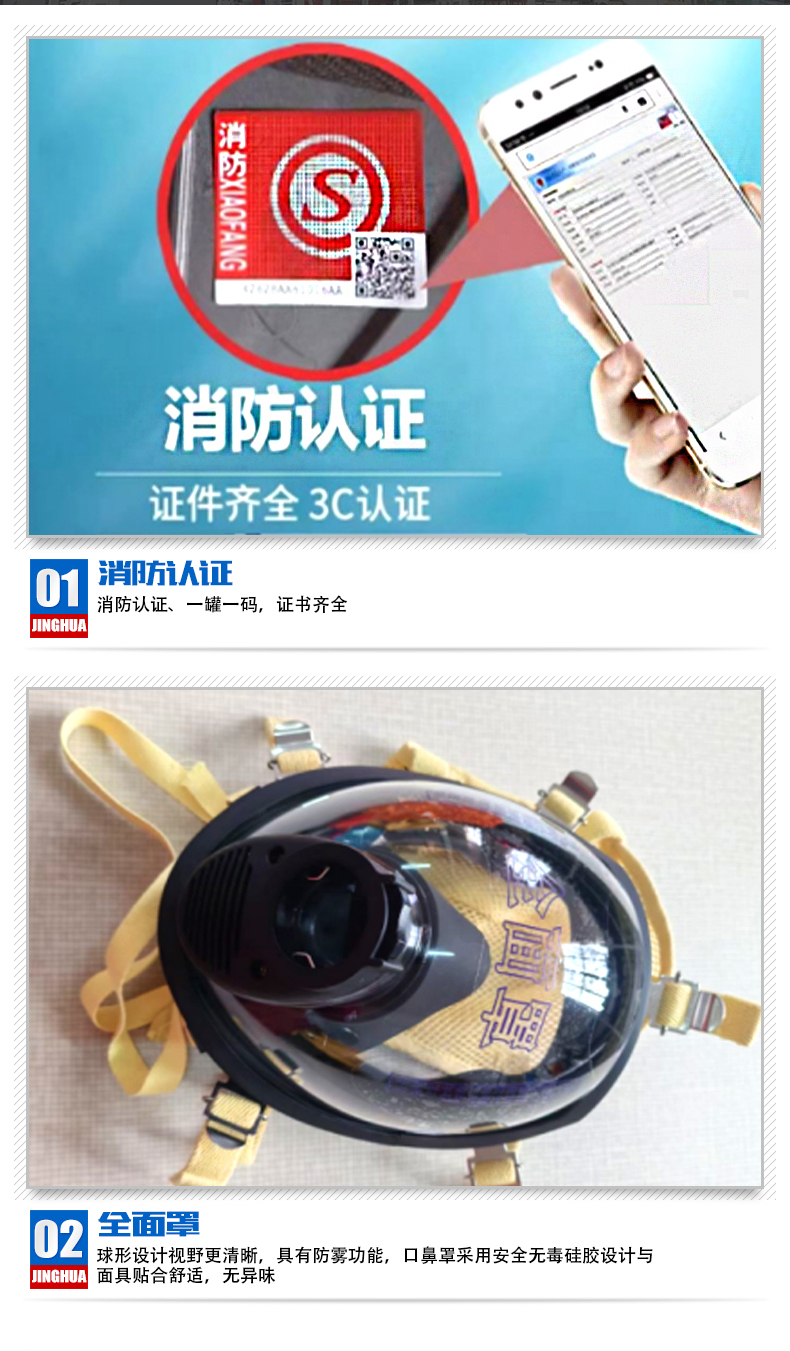 消防認證、一罐一碼,證書齊全;球形設(shè)計視野更清晰,具有防霧功能,口鼻罩采用安全無毒硅膠設(shè)計與面具貼合舒適,無異味;電集指針式與電子壓力表于一體,采用紅、黃、綠不同顏色的LED燈顯示壓力的變化范圍,結(jié)合電子壓力表使用,信號具有唯一性,同時具有跌倒報警功能;